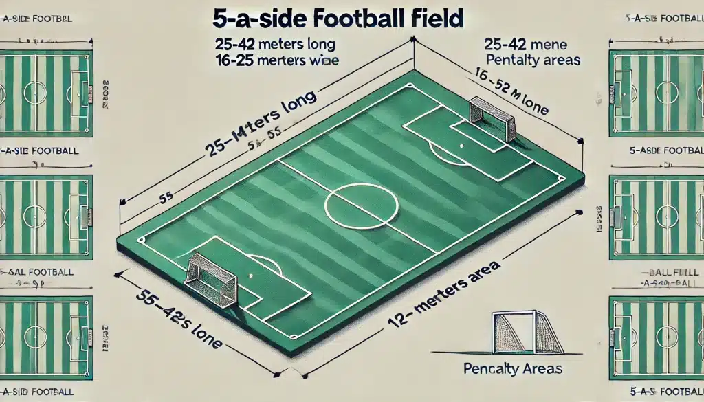 - ขนาดสนามฟุตบอล 5 คน เช่นในฟุตซอลจะมีขนาด 25-42 เมตร ยาว และ 16-25 เมตร กว้าง
